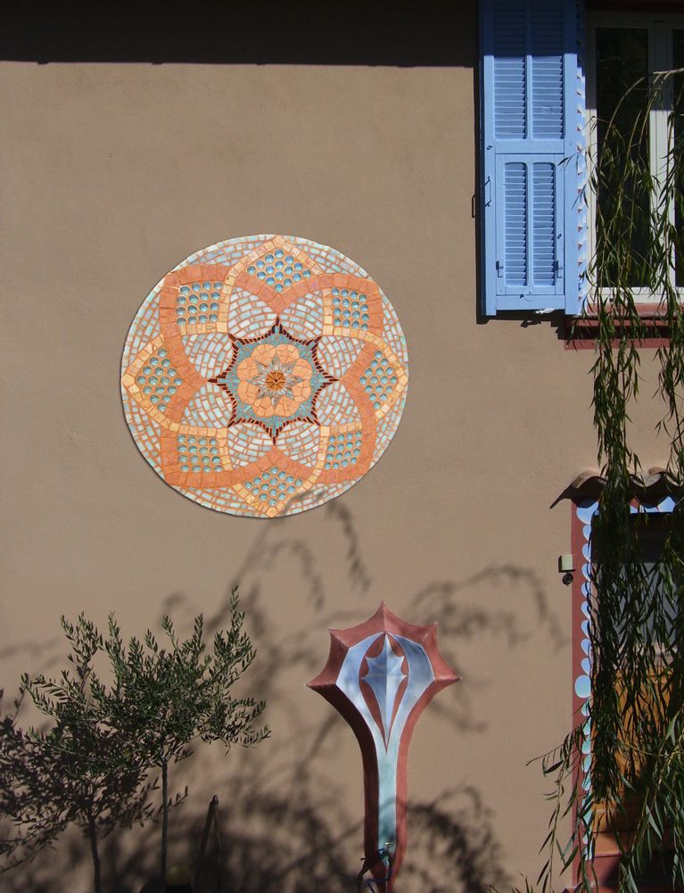 Mosaïque de 1,20 m de diamètre, verre, pâte de verre, carrelage et marbre, pose indirecte.